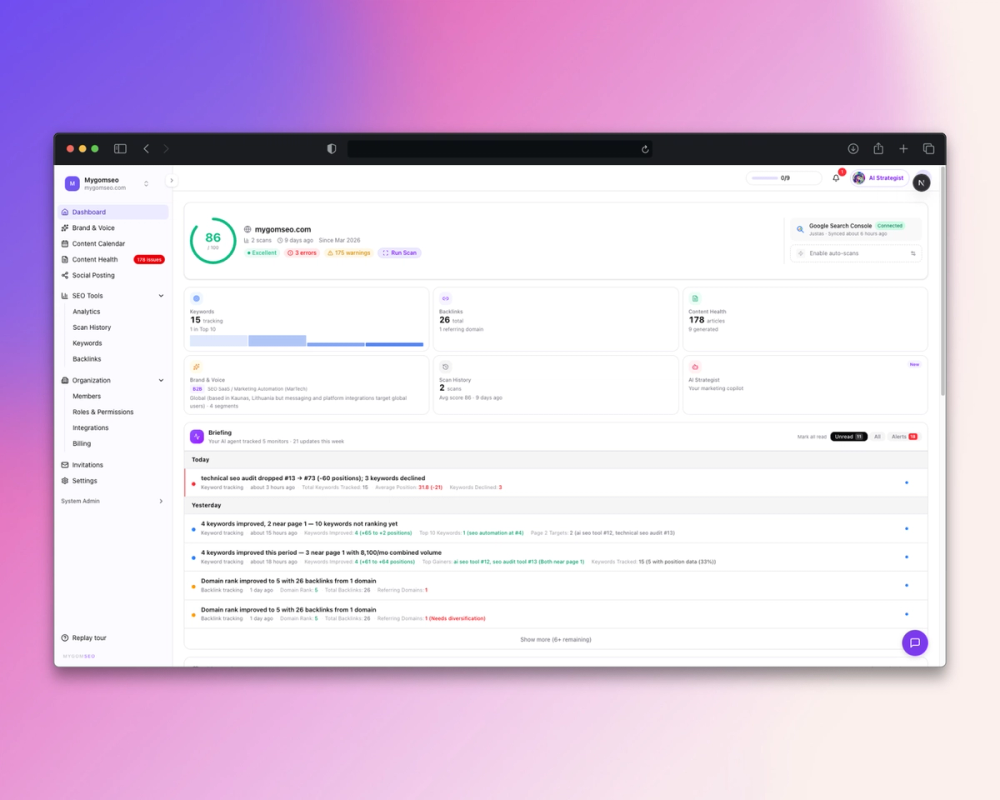 MygomSEO is an AI marketing agent that audits your site, writes SEO content, publishes to 12+ CMS platforms, posts to social, and monitors rankings 24/7.